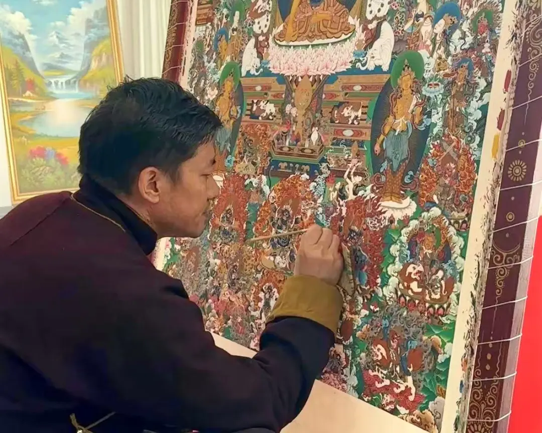 谈及创作,更登才让表示:“这幅作品算得上是‘两年磨一剑’,从甄选适龄菩提鲜叶、遵循古法完成避光发酵及晾晒定型等多道炮制工序,到研磨天然矿物颜料、精准起稿勾线,再到分层铺金、精修衣袂、恪守《造像量度经》造像仪轨开眼,每一道工序都精益求精。传承是技艺的本真根基,创新是文脉的时代生命力,这件凝聚两载心血的作品,便是我对唐卡艺术的敬畏之心、坚守之力与赤诚之爱的初心践行。”