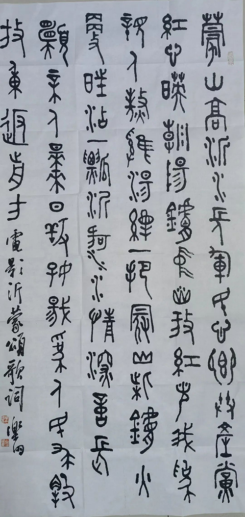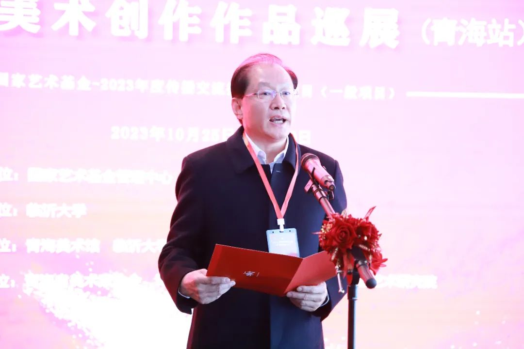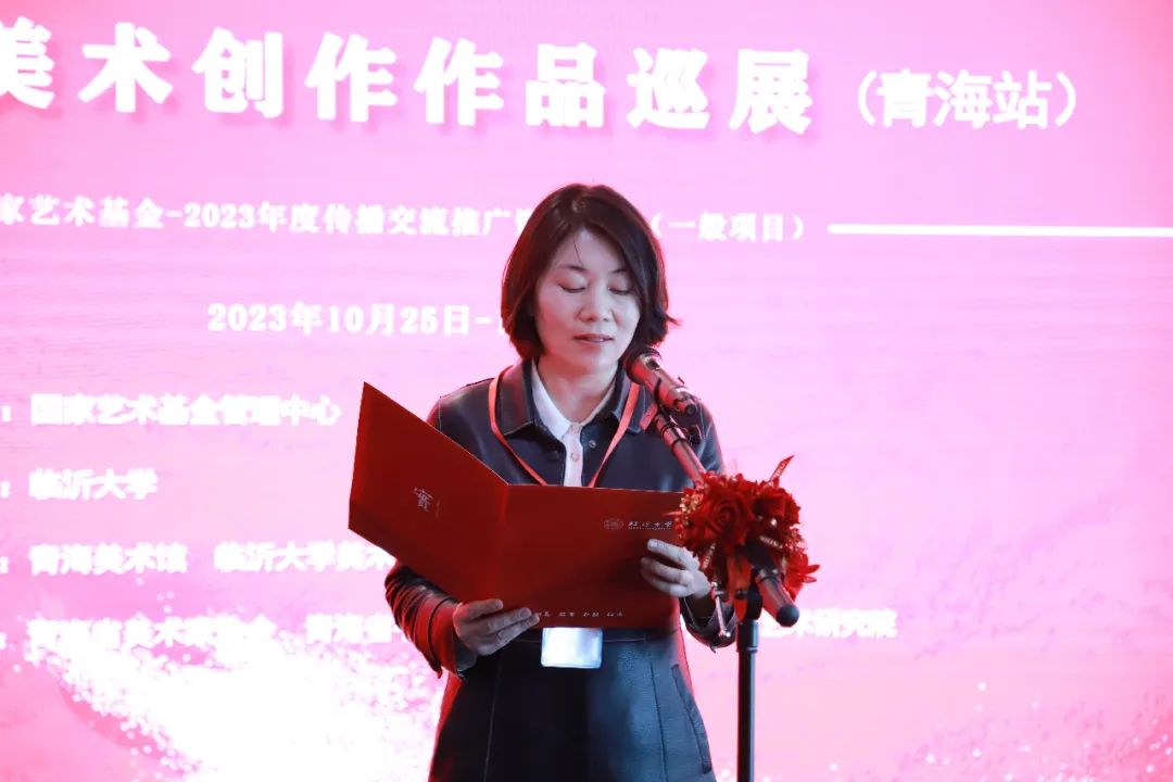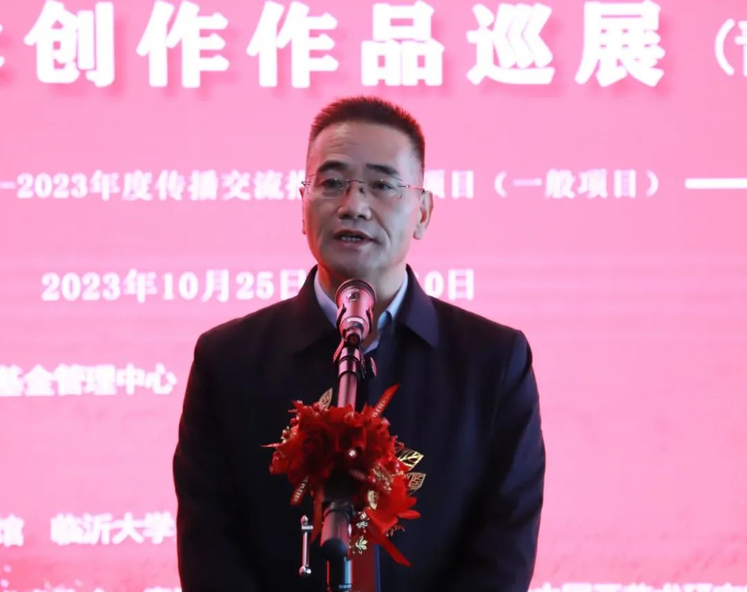 秦光明在致辞中指出:青海地处黄河之源,地大物博、民族众多、文化多元,是艺术创作的富矿区,也孕育了“两弹一星”为代表的青藏高原精神谱系。山东位居黄河入海口,是儒家文化的发源地,临沂人民更是铸就了宝贵的沂蒙精神。“我住黄河头,君住黄河尾”,两地同饮母亲河,同传中华文脉。我们要以本次展览为契机,聚焦使命任务、坚定文化自信,坚持以人民为中心的创作导向,弘扬中华民族优秀传统文化、社会主义先进文化和革命文化,加强交流互鉴,为繁荣艺术创作,为社会主义文化强国建设作出新的贡献。