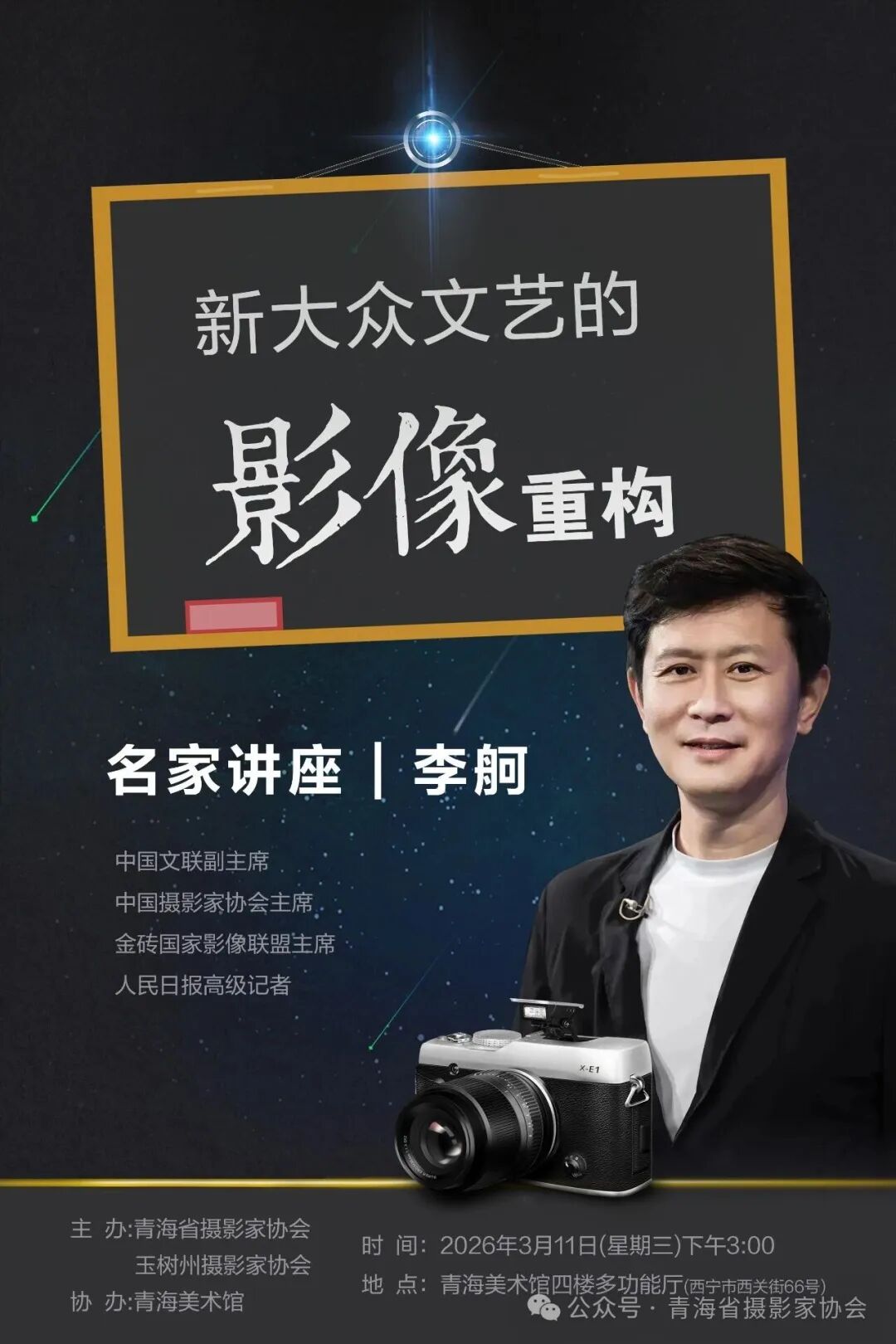 李舸,中国文联副主席、中国摄影家协会主席、金砖国家影像联盟主席,人民日报高级记者。 曾荣获中国摄影金像奖、中国新闻奖、中国新闻摄影记者金眼奖、中国新闻摄影金镜头奖、奥运会体育摄影作品金质收藏大奖等多项专业荣誉。担任国家艺术基金专家委员会委员。先后被授予“全国五一劳动奖章”、“第三届全国中青年德艺双馨文艺工作者”、“中央国家机关优秀专业技术能手”、“全国十佳青年摄影记者”、人民日报“十大杰出青年”等荣誉称号。三十年来,曾在多个国家举办摄影艺术展,并发行限量版艺术作品集。其艺术作品被中国共产党历史展览馆、中国国家博物馆、中国美术馆等国内外多家权威艺术机构收藏并永久展陈。 讲座将以摄影艺术为切入点,深入浅出地解析新时代技术变革中的艺术生产逻辑,力图启发受众以全新视角理解影像创作。结合新质生产力发展背景,指出影像类作品已成为中国网络视听产业的主流形态,并着重阐述新大众文艺所具备的共创、共融、共享三大底层逻辑。讲座强调创作者应深入生活,坚守以人民为中心的创作导向,在文化自信的基础上开展参与式创作,捕捉真实情感,共同探索新技术变革中的艺术创作与意蕴表达。